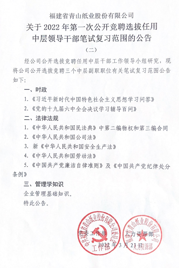 福建省必一运动纸业股份有限公司 关于2022年第一次公竞聘选拔任用中层领导干部笔试复习范围的公告(二)